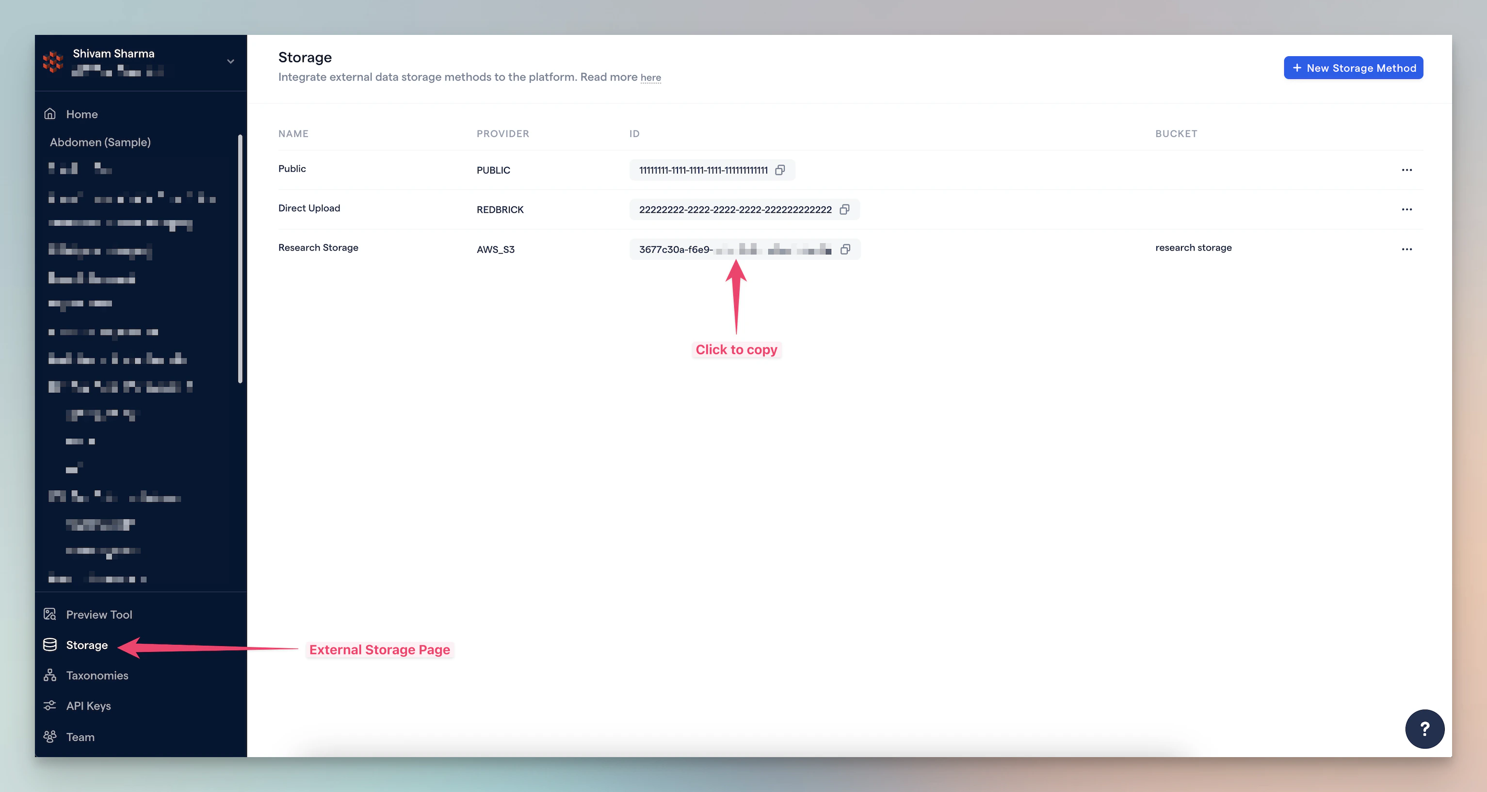 To import data stored in an external storage method such as AWS S3, be sure to use the Storage ID found on the Storage tab of your RedBrick AI account instead ofredbrick.StorageMethod.REDBRICK.
